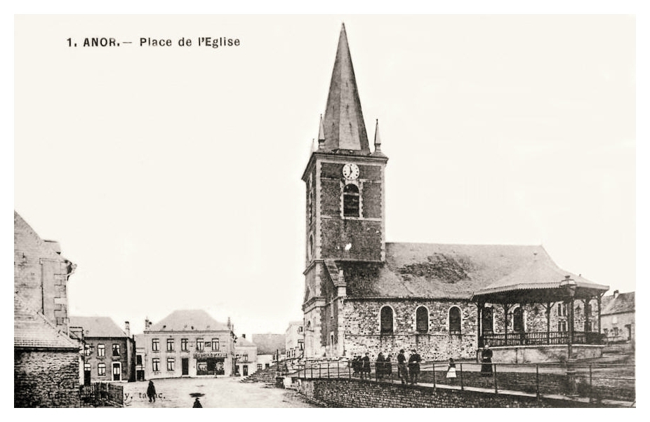 Sur la carte précédente : Anor. J’ai toujours vu un cœur anatomique dans la représentation du village sur une carte. J’ai entouré en bleu l’église Saint-Nicolas qui à défaut d’être au centre du village est au centre d’une place qui s’étend devant elle, sur sa gauche et derrière elle. Bordée de nombreux bâtiments dont des commerces, la mairie et une école, plusieurs rues et ruelles donnent accès à la place publique. C’est en 1930 l’un des principaux lieux de vie de la commune qui comporte un peu plus de 4000 âmes.