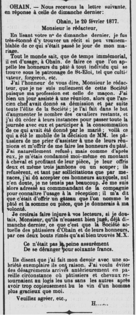 Il me faut maintenant retrouver cette coutume et découvrir si elle était locale ou plus étendue. Grâce à Alain DELFOSSE qui tient le site « Racines et Patrimoines en Avesnois » et son bulletin N° 24 de juin 2016, je suis allée faire un petit tour sur Gallica et dans le journal de Fourmies je trouve 2 autres articles, reliés l’un à l’autre puisque contant le même mariage de 2 points de vue différents dont celui du marié qui a usé de son droit de réponse. La transcription sont sur les pages 2 et 3 du bulletin, cité ci-dessus.
