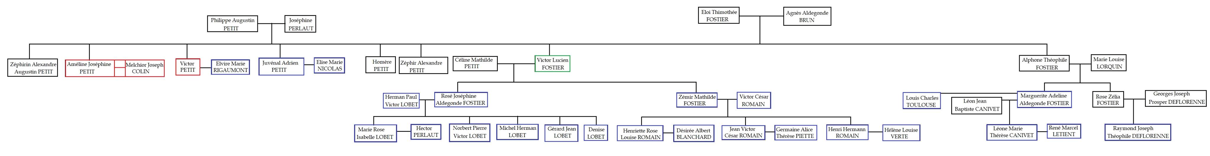 Les recensements de 1906 font état d’un couple PETIT-NICOLAS, Juvénal né en 1850 à Anor et Elisa née en 1851 à Mariembourg (Belgique) ont 2 enfants Ida née ne 1883 et Paul né en 1888. Après recherches j’ai identifié Juvénal comme étant Juvénal Adrien PETIT, frère de Céline Mathilde PETIT, feue la femme du défunt. Il épouse Elise Marie NICOLAS en 1876. J’ai alors poursuivis mes investigations autour des frères et sœurs de Céline. Victor PETIT (né en 1848) épouse le 03/07/1876 Elvire Marie RIGAUMONT. Le 11/05/1870, Améline Joséphine PETIT épouse Melchior Joseph COLIN.