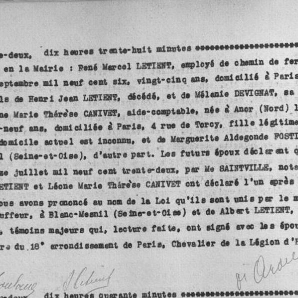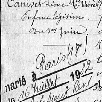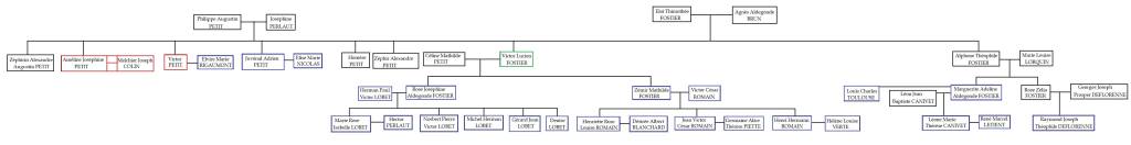 En revenant sur la famille FOSTIER, j’ai pu observer que Victor Lucien FOSTIER n’était pas fils unique et qu’il avait au moins un petit frère né en 1854, Alphonse Théophile FOSTIER marié avec Marie Louise LORQUIN dont il eut deux filles, Marguerite Adeline Aldegonde FOSTIER et Rose Zélia FOSTIER. La première, Marguerite, épouse dans un premier temps Léon Jean Baptiste CANIVET puis après un divorce, elle épouse Louis Charles TOULOUSE. Rose épouse quant à elle Georges Joseph Prosper DEFLORENNE. J’ai trouvé pour chacune un enfant : Raymond Joseph Théophile DEFLORENNE et Léone Marie Thérèse CANIVET. Léone épouse le 16/07/1932 un certain René Marcel LEDIENT à Paris XVIII d’après la mention marginale, mais l’acte de mariage confirme le T et non le D…