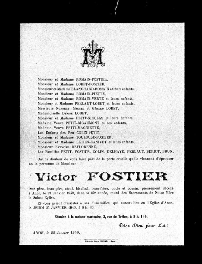 Ce que je sais avant de démarrer… Victor est né le 09/09/1851, il est le fils de Eloi Thimothée FOSTIER et Agnès Aldeguonde BRUN. Il a un petit frère, Alphonse Théophile, né le 28/11/1854. Il a épousé Céline Mathilde PETIT le 28/04/1875. La même année, Zémire Mathilde FOSTIER, leur fille, est née. Il faut attendre le 24/12/1890 pour que naisse Rose Joséphine Aldeguonde, leur seconde fille. Zémire épouse le 23/06/1894 Victor César ROMAIN et Rose épouse Herman Paul Victor LOBET le 26/02/1912. Ainsi les couples « ROMAIN-FOSTIER » et « LOBET-FOSTIER » ne sont pas un mystère.