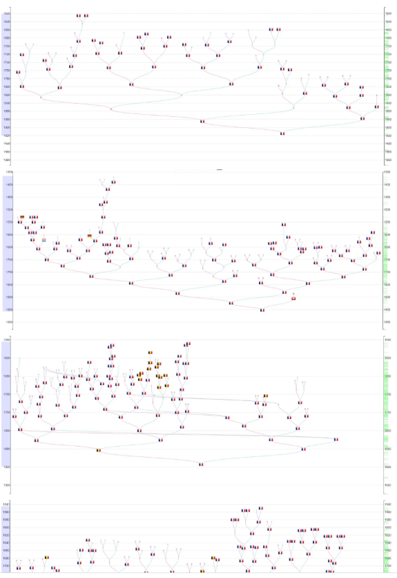 Les 8 branches de mon côté ont toutes un format relativement similaire : « Bleu-Blanc-Rouge » Français parsemé de « Noir-Jaune-Rouge » Belge de-ci de-là. Et oui, mes ancêtres ont vécu à la frontière Franco-Belge dans une même zone du Nord à proximité de l’Aisne, et des Ardennes.