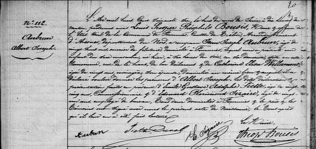 Vendredi 8 juin 1866, Jean Joseph AUBRUN a 28 ans, il est ouvrier d’une des 37 filatures de la ville où il est domicilié : Fourmies dans le Nord. Mais s’il se présente ce jour en mairie c’est pour déclarer qu’hier à six heures du soir son épouse depuis 1863 Catherine Elisa WILLAMME a donné naissance en leur foyer (Rue de la Haut) à Albert Joseph AUBRUN, leur fils et second enfant d’une fratrie qui en comptera 4. En effet, en 1864 est née Sidonie Elisa AUBRUN (Hameau des Trieux-de-villers à Fourmies), sœur aînée d’Albert et en 1872 et 1875 naîtront respectivement Gustave AUBRUN son cadet (Hameau des Trieux-de-villers à Fourmies) et Ernest AUBRUN le benjamin (Rue du Défriché à Fourmies).