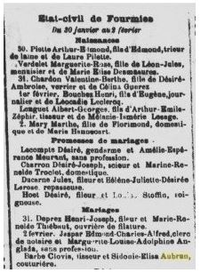 Albert est âgé de 18 ans, lorsque sa sœur de 2 ans son aînée quitte le domicile familial. Sidonie se marie en effet le lundi 02 février 1885 à Fourmies avec Clovis BARBE. 2 publications dans le journal de Fourmies les 22 et 25 janvier 1885 dans le Journal de Fourmies annonçaient la promesse de mariage alors le jeudi 05 février c’est cette fois le mariage de la petite couturière de la famille et de son tisseur d’époux qui y est annoncé.