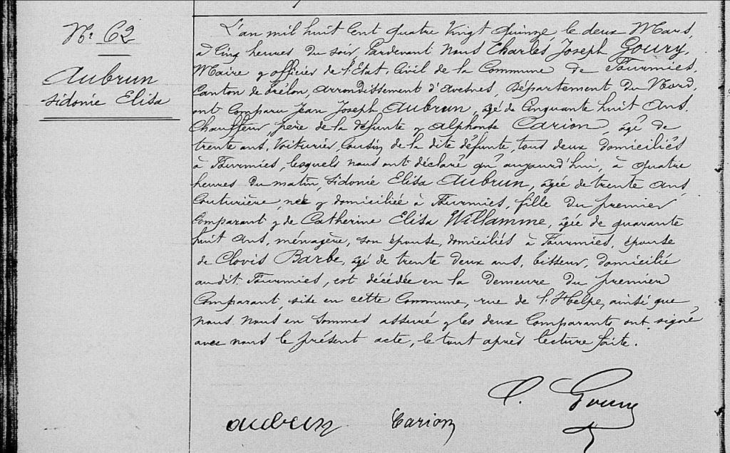 Le jeudi 12 juillet 1894, Gustave se marie, la nouvelle belle-sœur d’Albert se nomme Marie Alphonsine NINITE. La petite nouvelle est âgée de 20 ans et originaire elle aussi de Fourmies. La famille vit une première fois le deuil avec le décès de Sidonie le 02 mars 1895 à l’âge de 30 ans. Il semblerait qu’elle ne laisse aucune descendance, Clovis est seul.