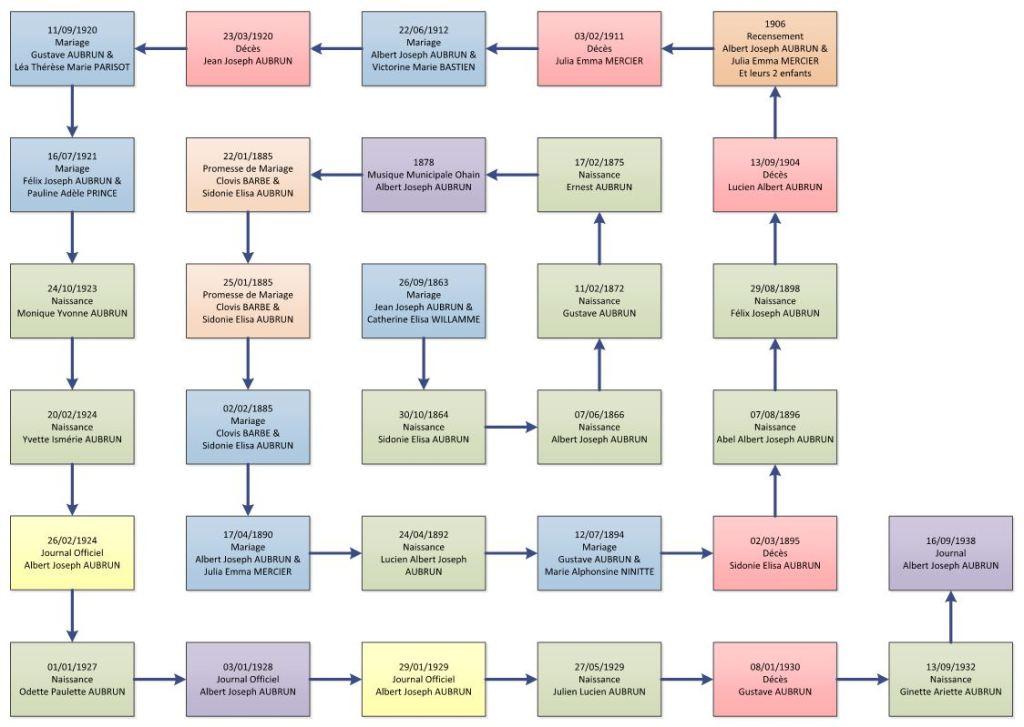 Samedi 08 août 1896 et lundi 29 août 1898, la famille AUBRUN dont Albert est le chef s’agrandit. Abel Albert Joseph et Félix Joseph naissent à Ohain où la famille a emménagé. Les années s’annoncent sous le signe des rires d’enfants. Albert, père de famille de trois garçonnets a changé de métier, la route Ohain-Fourmies à l’aube du XXème siècle dans la campagne ch’timi n’est pas encore motorisée pour tout le monde bien au contraire. Albert est devenu graisseur dans une entreprise familiale du village, la « maison-Ernest Degousée et Ce ».