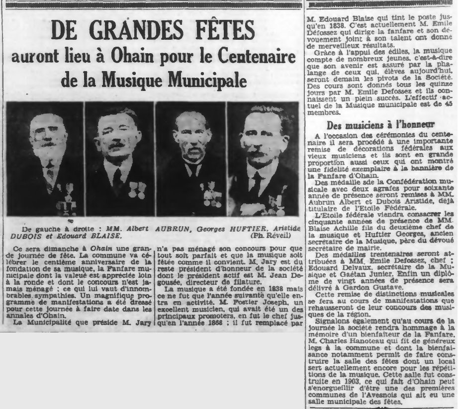 Vers 1878, Albert devient musicien (Je cherche encore des informations sur le ou les instrument(s) qu’il jouait) et le sera pendant près de 60 ans, c’est pourquoi en septembre 1938, lors du centenaire de la musique municipale d’Ohain (commune limitrophe de Fourmies) il sera mis à l’honneur avec, entre autres, messieurs HUFTIER, DUBOIS et BLAISE. Il y reçoit alors la médaille de la confédération musicale avec deux agrafes pour 60 années de présence < Attention dans le JdF c’est noté 55ans pas 60 !!! >, il était déjà titulaire de l’Étoile Fédérale (50 ans).