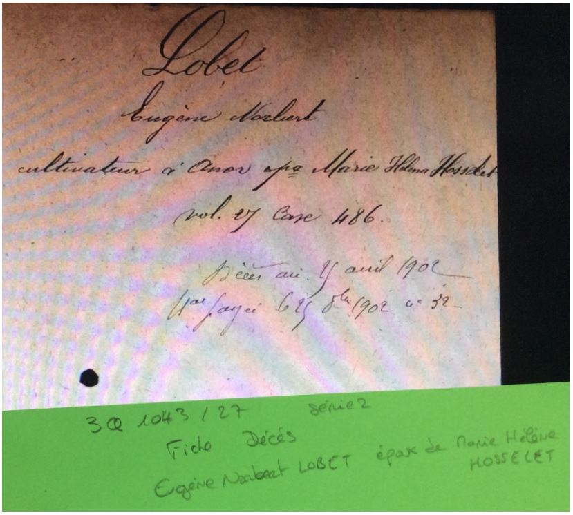 Dans un premier temps, j’ai parcouru les fiches décès. J’ai pu mettre la main sur celle de son époux, Eugène Norbert LOBET.