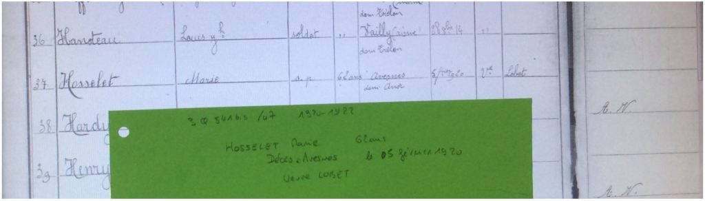 Mais toujours rien pour le moment sur Marie Hélène bien que j’ai parcouru les fiches décès du canton de Trélon et de celui d’Avesnes… En continuant la série 3 Q, je me suis attaquée aux TSA, Tables de Successions et Absences. Rien sur Trélon de 1905 à 1939. Après une petite pause je me lance dans les TSA du canton d’Avesnes pour la même période. BINGO ! HOSSELET Marie, veuve LOBET, domiciliée à Anor, est décédée à Avesnes le 5 février 1920 à l’âge de 62 ans. Tout colle : le veuvage, l’âge, le domicile…