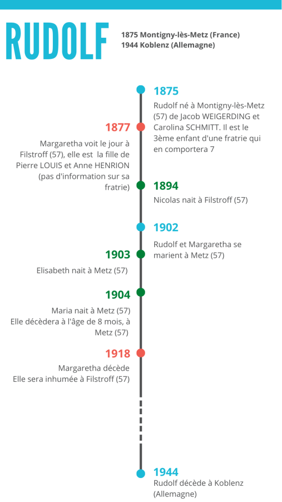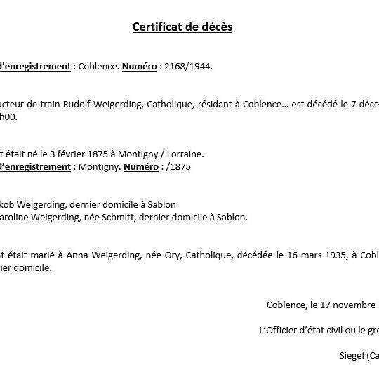Dans ce document s’y trouve en plus de la confirmation du lieu et de la date de décès de Rudolf, une épouse jusqu’ici inconnue ! Il se serait donc remarié après le décès de sa femme en 1918. Me voici alors avec de nouvelles questions, sur que fut sa vie de 1918 à 1944… Quand e où se sont-ils mariés ? Ont-ils eut des enfants ? Voici ici résumé ma base pour repartir à la recherche d’informations sur Rudolf…