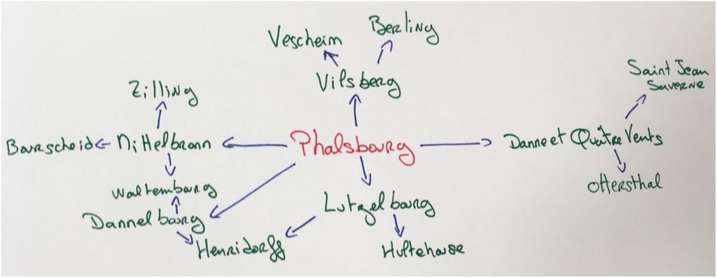 C’est un peu sombre je vous l’accorde, mais la carte a de l’âge… Désolée d’avance si je lis mal certains caractères, on distingue (dans le désordre et non exhaustivement) les villes de Burschim, Homerting, Niderweiller, Henrindorf, Wilisberg, Mittelbrun, Lutzelburg, Heinridiorff, Saint-Michael, Phalsbourg, Saint-Jean des choux, Thanne, Denelburg, Dosen, Erlezen, Rosenwiler, Muntzwiller, Etterstall, Saverne… Avec la carte actuelle, j’avais préparé un schéma très très très simpliste des communes limitrophes :