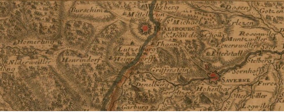 Il y avait de bonnes chances pour que mes recherches se limitent à Phalsbourg, mais sans savoir, j’ai préféré préparer le terrain et connaître ce qu’il y avait comme communes « dans les environs » de Phalsbourg. Lorsque l’on connait bien une zone alors sa géographie et/ou les villes limitrophes n’ont pas grand secret. Mais lorsque l’on vient d’une autre région c’est un peu plus difficile de définir « dans les environs de Phalsbourg »… Me voilà donc à la recherche d’une carte de la région de Phalsbourg pour débuter. La carte 2016 c’est bien, mais si les noms des communes ont changés ou certaines ont fusionnées alors vous n’êtes pas plus avancé. Il me fallait donc une carte de 1720-1760.