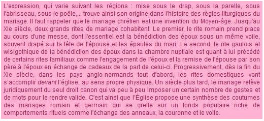 Il y a quelques années, j’ai assisté à un mariage où les époux furent entourés d’un genre d’étole pendant la bénédiction par le curé. Je ne connaissais pas cette coutume et pour être franche j’avais presque oublié cet évènement. Cependant, il vient de m’être remémoré en lisant « Enfants abandonnés, enfants sans père » car je suis tombée sur une peinture représentant un « mariage sous le voile dans les années 1860″. J’ai alors découvert que ce genre de mariage servaient souvent à légitimer les enfants nés hors mariage. Voici un extrait de l’explication : Sous l’ancien régime, les enfants naturels étaient légitimés lors du mariage des parents. Cette légitimation prenait la forme symbolique de la « mise sous le voile » de l’enfant lors de la cérémonie du mariage.