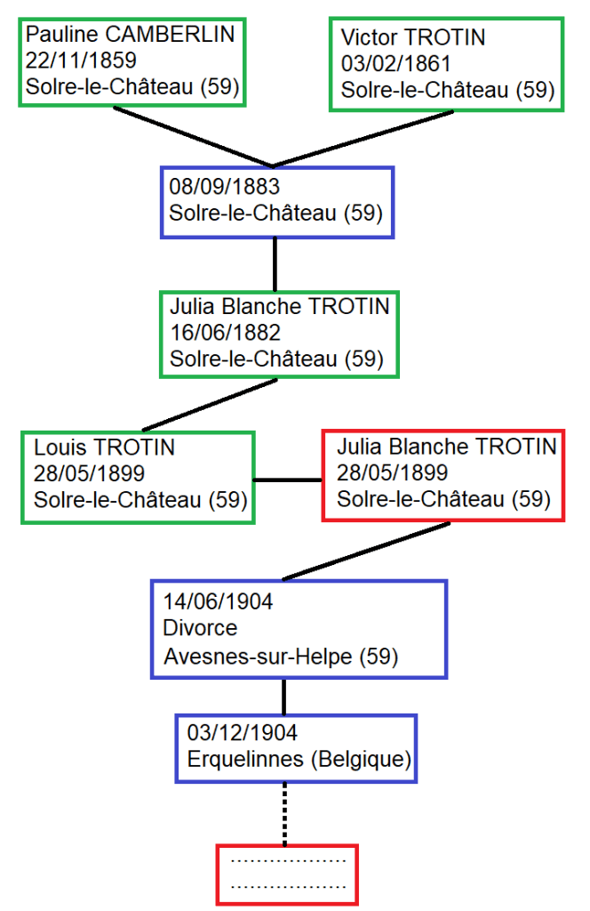 Je suis actuellement au moment de la rédaction de ce billet en train de préparer une chronique sur la vie de mon arrière-grand-père (Louis TROTIN) pour faire une surprise à mon père. La mère de mon AGP est morte en couche, il fut élevé par sa grand-mère Pauline CAMBERLIN comme j’en parle dans mon article Une vie difficile – Pauline CAMBERLIN. Je me suis alors rendu compte que mes informations concernant son grand-père Victor TROTIN s’arrêtent à son remariage à Erquelinnes en Belgique avec Armel HABEUVE. Aucun décès enregistré.
