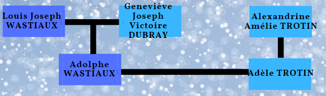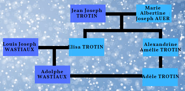 Si un Louis Joseph WASTIAUX est bien le père d’Adolphe, cependant sa mère est Geneviève Joseph DUBRAY et non Elisa TROTIN. Adolphe et Adèle ne sont donc pas cousins. L’identité de la mère d’Adèle est également confirmé : Alexandrine Amélie TROTIN.