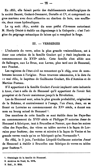 On trouve également dans le bulletin V.8 de la « Société d’études de la province de Cambrai » paru en 1899 des informations sur les verreries d’Anor et sur la famille GOULART. Ainsi on peut lire la page 75 dudit document :