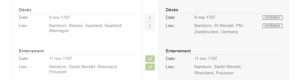 Viennent ensuite celles qui font rire dont celle-ci que je souhaiterai partager avec vous. À gauche mes données. À droite les données dont la correspondance est à vérifier. Pensez vous qu’ils aient gardé le mort en chambre froide pendant 6 mois ?