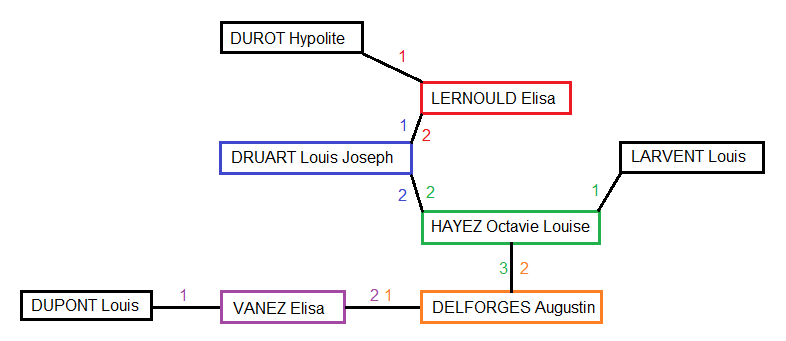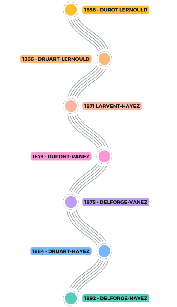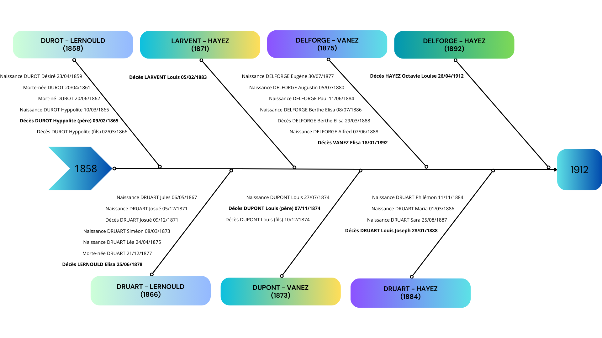 Voyez-vous se dessiner l’enchevêtrement des unions entre 1858 et 1892 ? Avez vous réussi à relier tout ce beau monde sans poser à l’écrit les veuves et veufs de cette cascades ? Je ne sais pas quel visuel est le plus parlant mais voici la succession chronologique de ces mariages :