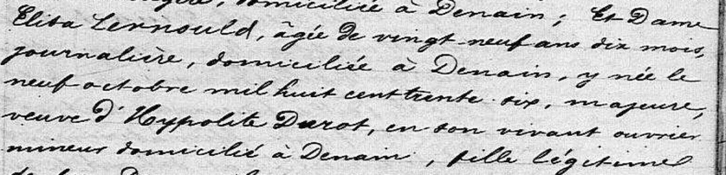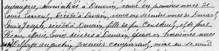 Et c’est là que lire attentivement un acte se révèle judicieux, même si on le sait parfois on va trop vite. Ces recherches n’étant pas faites pour mon arbre personnel, j’essaye de faire plus attention encore. Quelle bonne idée ! Si pour monsieur c’est un second mariage (premier mariage en 1866 avec LERNOULD Elisa) il s’avère qu’il en est de même pour mademoiselle qu’il faut en fait appeler madame (premier mariage en 1871 avec LARVENT Louis). La recherche du premier mariage de Louis Joseph s’avère elle aussi pleine de surprise puisque la moitié se présente à la mairie : veuve d’un mariage en 1858 avec DUROT Hypolite !