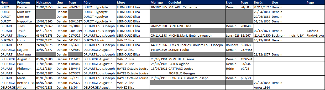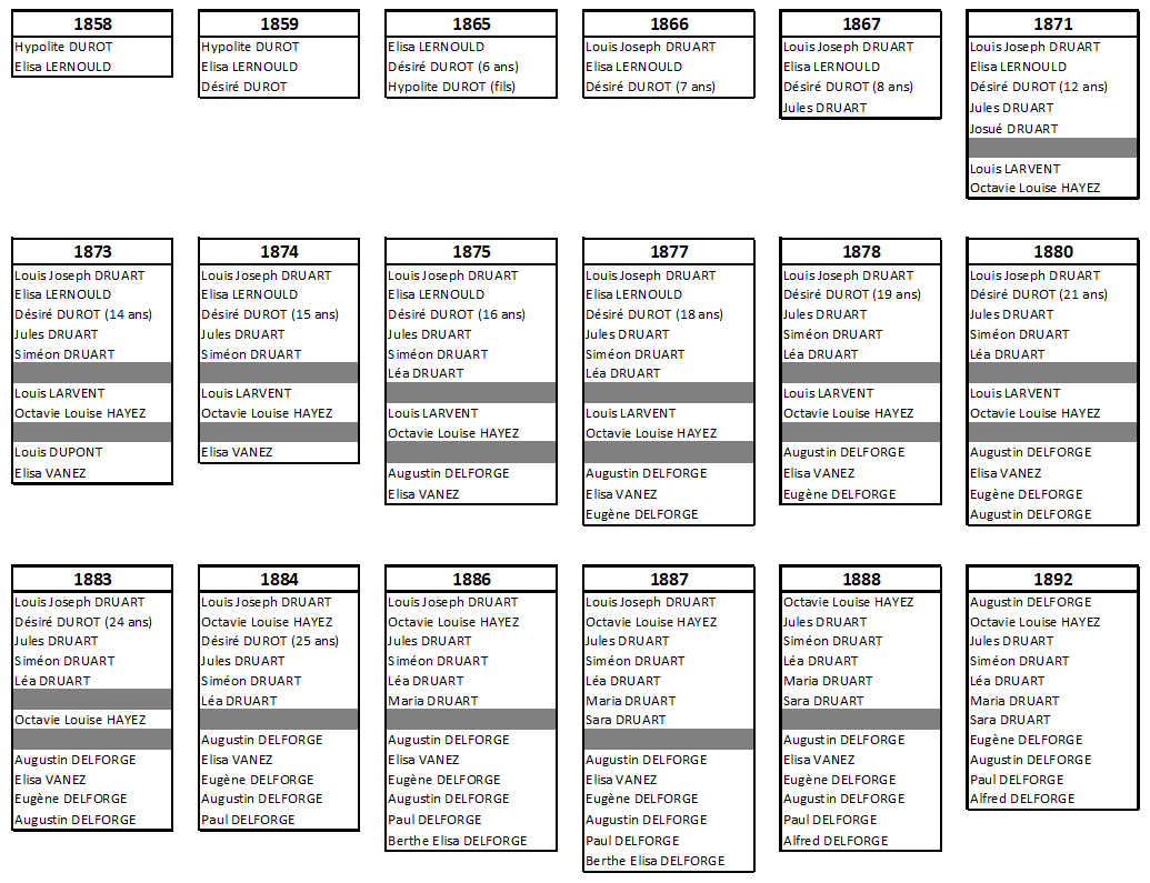 J’ai tenté d’établir à partir de ces données la composition des ménages au fil des années et des événements NMD de ces couples afin de conclure cette page. Seuls les recensements de 1901 et 1906 sont disponibles en ligne, ils sont donc hors temps pour cet exercice. Il me faudrait donc me déplacer (ou que quelqu’un aille sur place) pour vérifier les recensements de 1891 pour confirmer au moins la dernière étape en 1892…